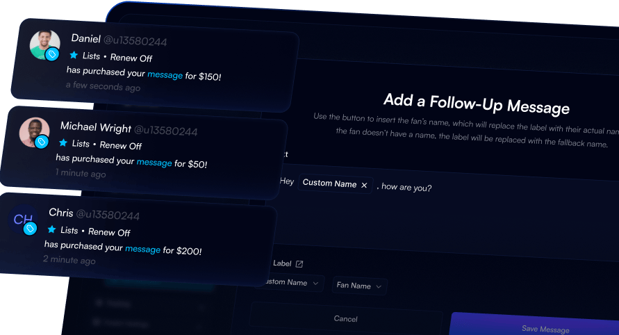 Schedule automatic follow up messages to fans that saw your message but didn’t purchase your PPV and use fully customizable welcome messages with time delays, follow ups and media attachments.